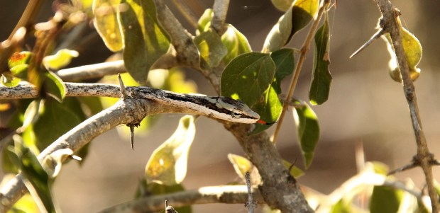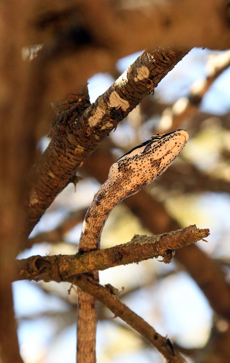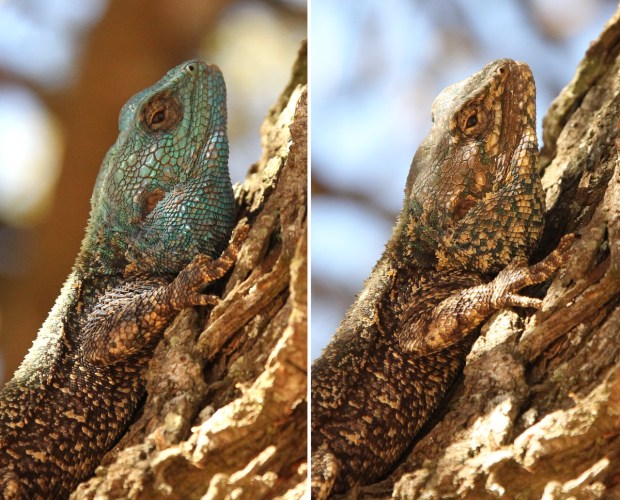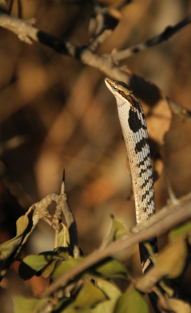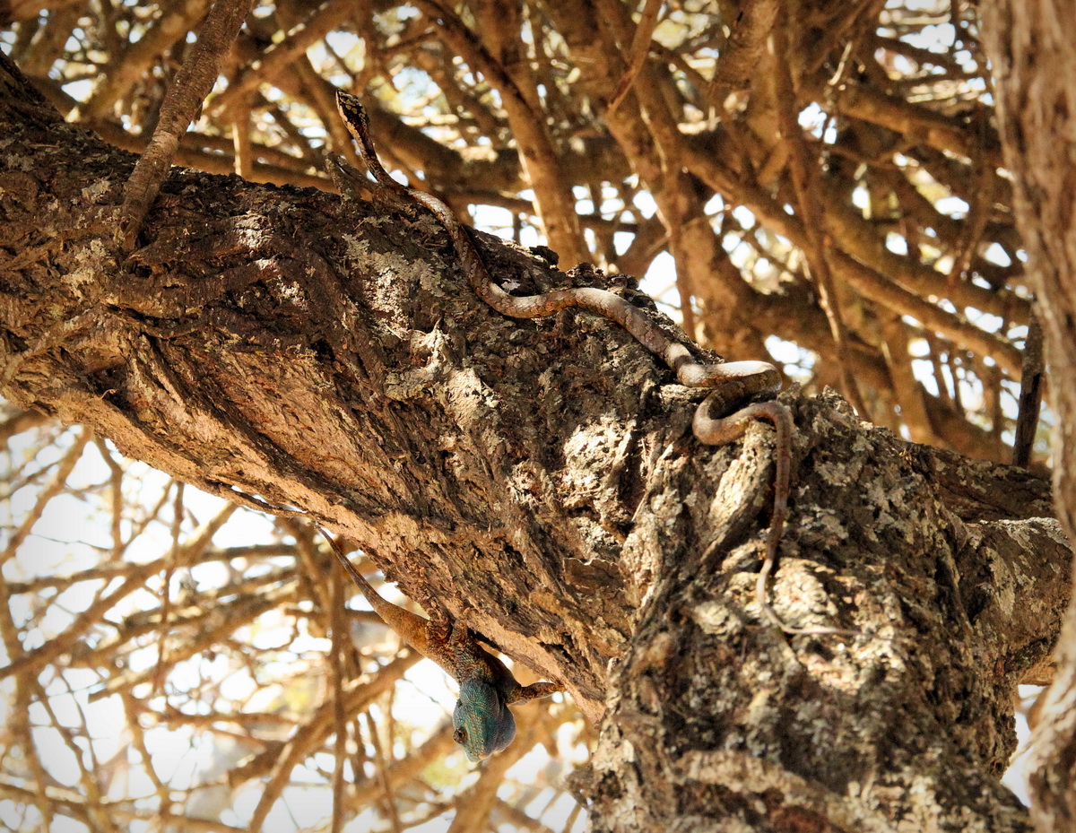 If they do not move it is almost impossible to spot them. But the human eye detects movement quite well so the two snakes were detected as they were sliding through vegitation. The Agama was sitting very still as one of the snakes moved up on the opposite side of a tree branch.